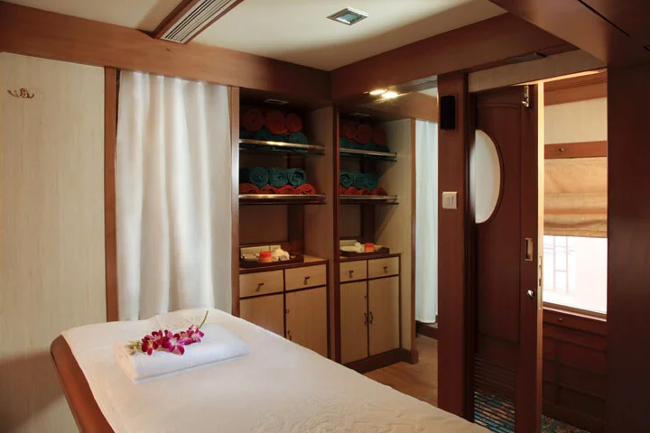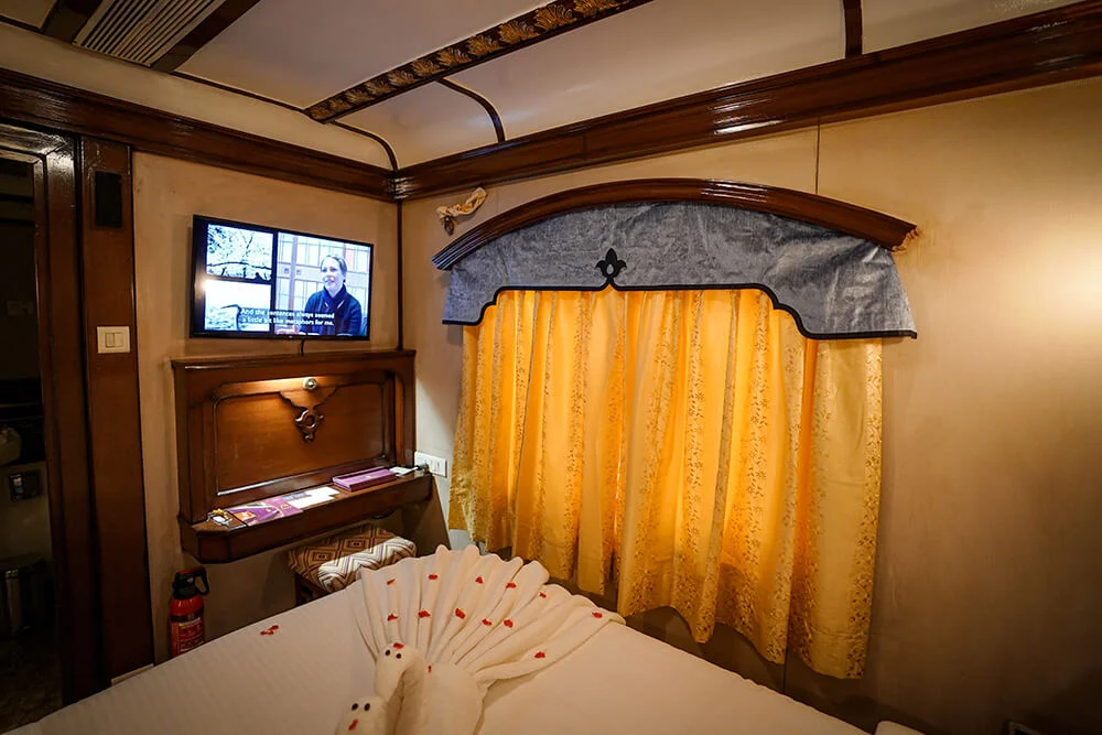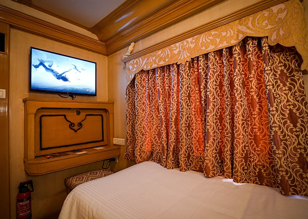 Fully air-conditioned coaches feature beautifully designed twin and double cabins with attached bathrooms, hot and cold water, and thoughtful amenities. Rich interiors inspired by South Indian palaces create a warm, graceful ambiance, while large windows frame scenic vistas—ancient temples, spice-laden hills, and sun-kissed shores.